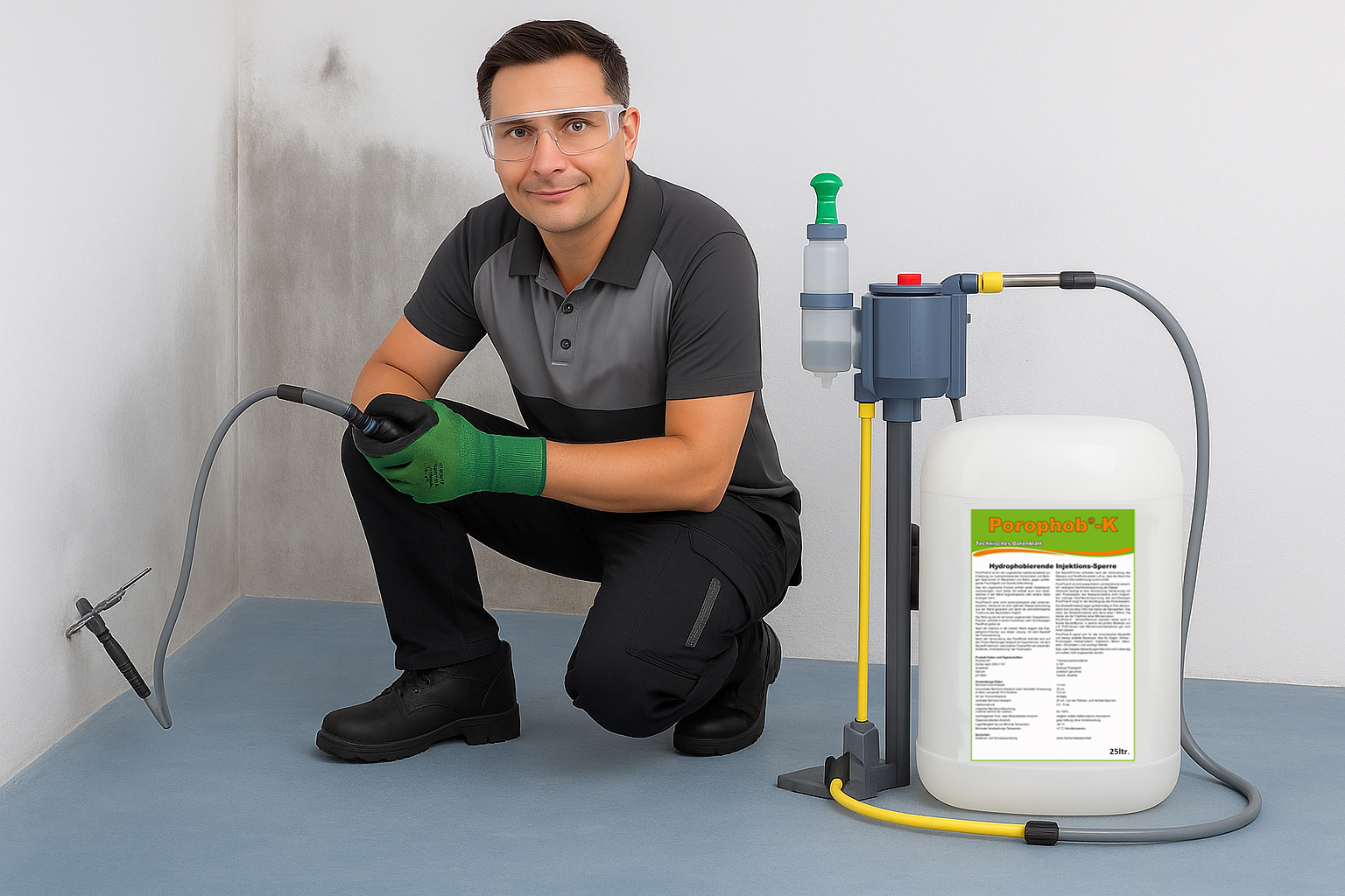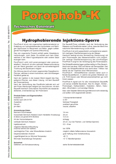 Porophob-K ist eine wasserfreie, rein organische Polymerlösung. Sie enthält weder bauschädliche Salze noch salzabspaltede Stoffe. Porophob-K ist ein sogenanntes Hydrophobiermittel. Es macht Baustoffe wasserabstoßend (hydrophob) ohne deren Poren zu verstopfen. Es wird in den Problembereichen in die Wand injiziert, wo es sich unter Wasserverdrängung verteilt. Das Wirkstoffpolymer von Porophob erzeugt auf den Porenwänden einen hauchdünnen Film mit sehr niedriger Oberflächenspannung. Die „innere Oberfläche“ des Baustoffs erhält praktisch eine „Innenlackierung“, die aufgrund ihrer niedrigen Oberflächenspannung Wasser abstößt. Dieser Effekt ist von beschichteten Bratpfannen bekannt, bei denen die Beschichtung allerdings eine noch niedrigere Oberflächenspannung besitzt und deshalb sogar Fett abstößt. Das Produkt verstopft nicht die Baustoffporen.